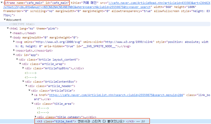 네이버 카페, 블로그 크롤링시 우리를 괴롭히는 iframe이라는 존재, 위 이미지를 보면 iframe 안에 글 제목이 들어가 있다.