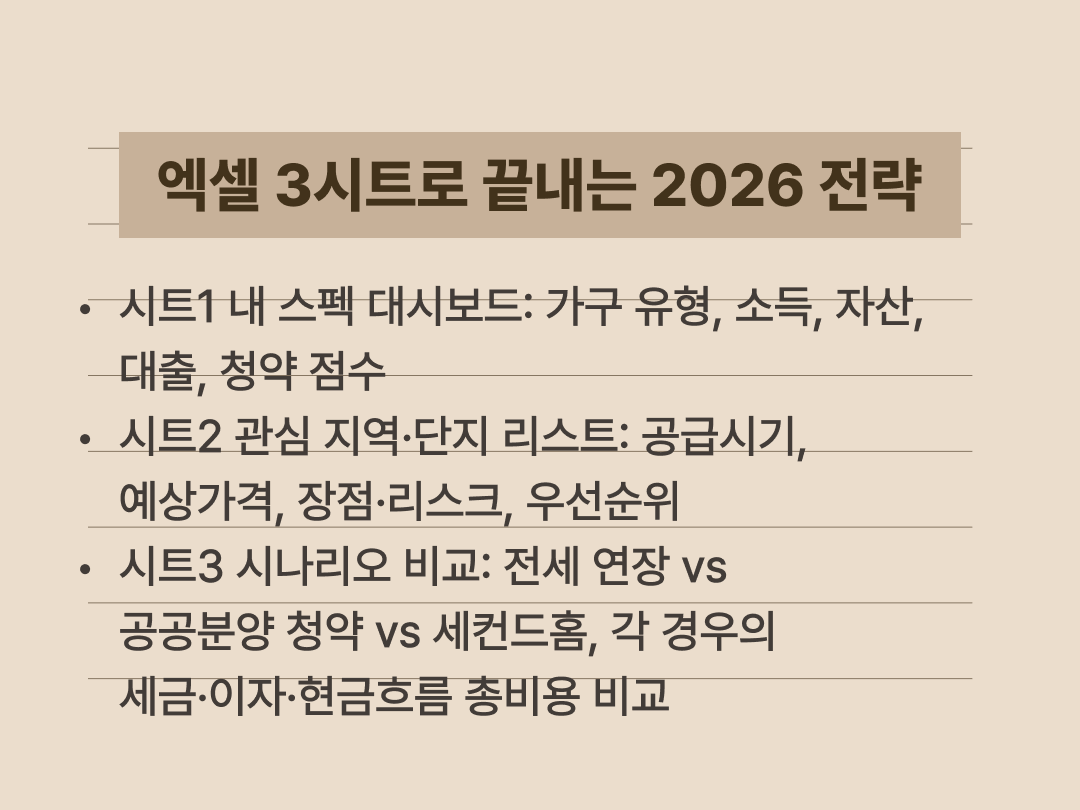 - 엑셀 3시트(내 스펙, 관심 지역 리스트, 시나리오별 비용·세금 비교)를 만들어 놓으면, 정책이 바뀌더라도 칸만 조금씩 바꿔가며 10년짜리 주거 전략판으로 계속 활용할 수 있다.