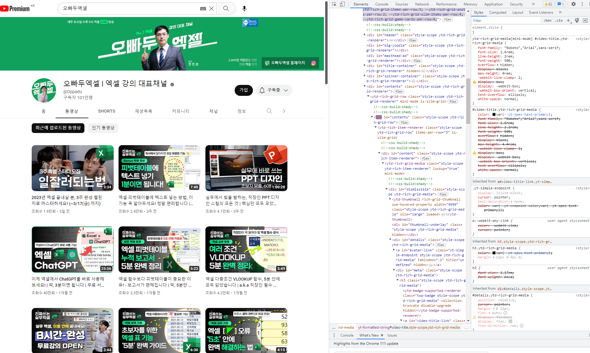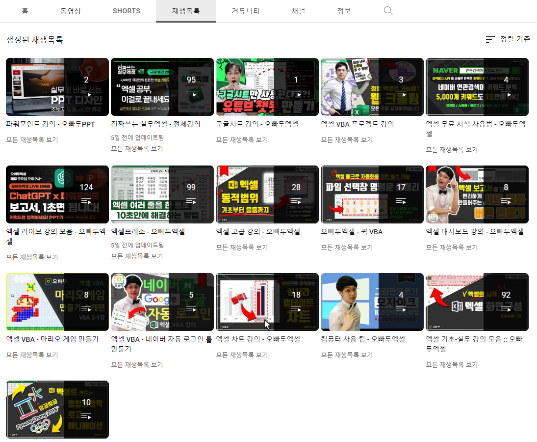 그때 발견한 엑셀의 신이 바로 유튜버 선생님 "오빠두엑셀"님... (처음엔 이름이 너무 이상해서 필요한 기능 하나만 들으려 헀지만...) 이 분의 영상을 하나 보고 나서는 날을 잡고 거의 모든 강의를 한 번씩 훑었다.