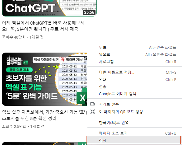 방법 2. F12대신 웹페이지 내 아무곳에서나 오른쪽 마우스 클릭> " 검사 " 를 클릭하면 개발자 도구 화면이 나타난다.