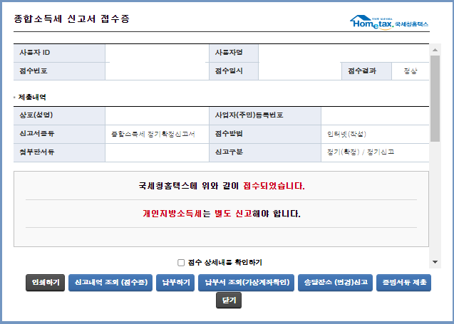 결정된 세액은 바로 홈텍스상에서 납부할 수도 있고(납부하기 버튼 클릭) 나중에 납부(납부서 확인 버튼 클릭)할 수도 있습니다.