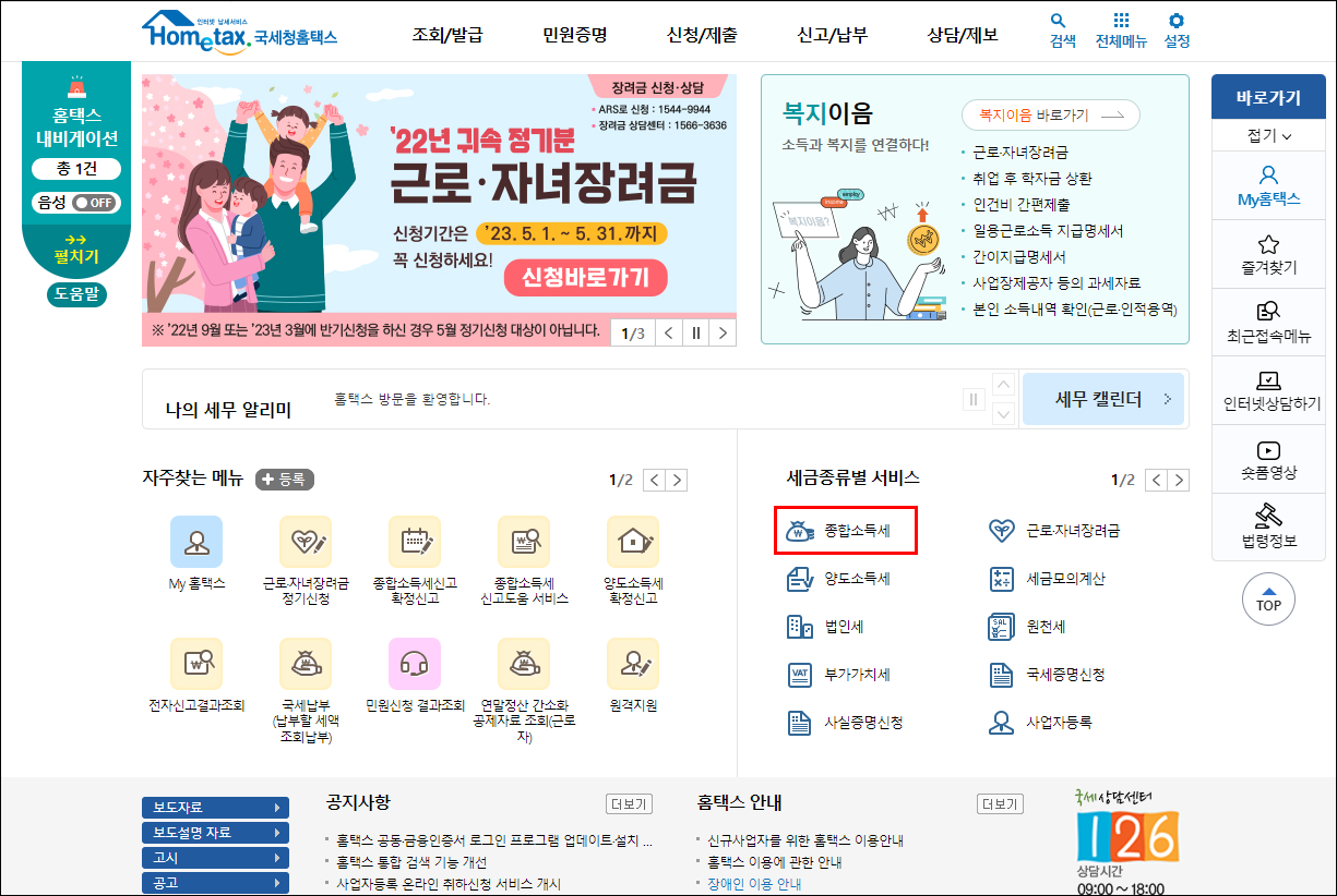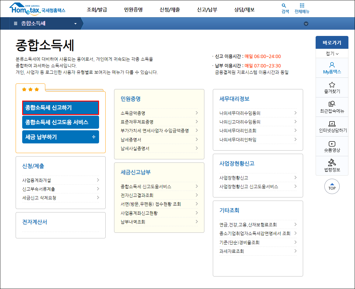 2) 로그인 후 하단에 있는 종합소득세 선택 > 종합소득세 신고하기 클릭