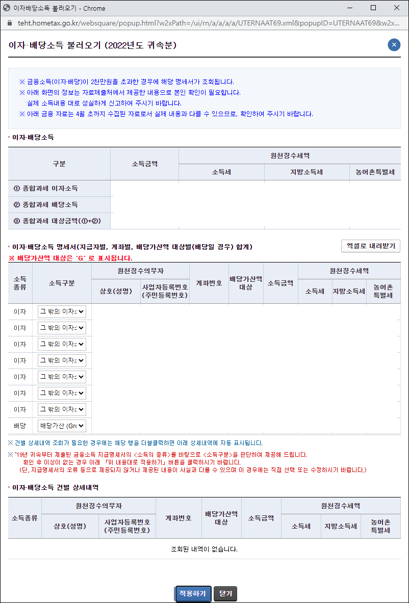 배당소득 : 상단에 위치한 이자배당소득 불러오기 클릭 > 팝업화면에서 조회된 이자소득, 배당소득 클릭 후 적용하기