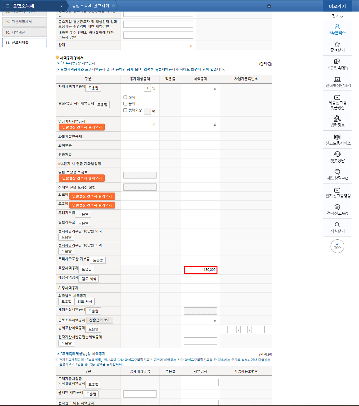앞서 설명했듯이 4. 소득공제명세서 "특별공제"와 중복적용이 되지 않습니다. 단계를 왔다갔다해가면서 하나씩 적용해보고 더 유리한 쪽으로 결정합니다.