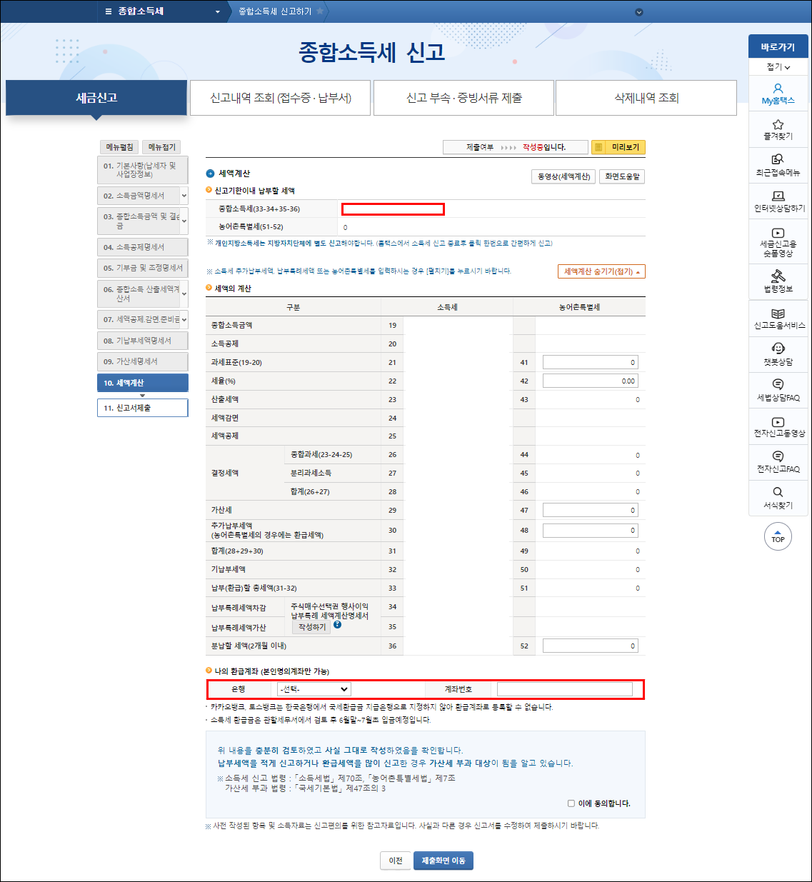9) 세액계산 : 종합 소득세를 확인하고 환급금(- 금액)이 나온 경우 아래 나의 환급계좌에 본인 명의의 계좌를 등록합니다.
