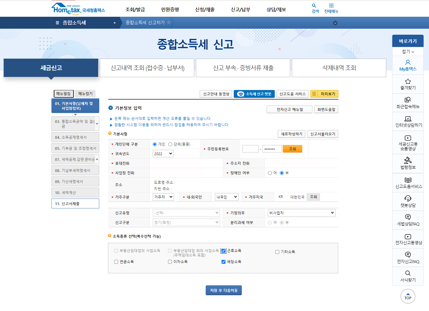 2) 기본사항 작성 > 주민등록번호 작성 후 조회하기 클릭> 나의 소득종류 찾기에 근로, 이자, 배당 소득선택 후 적용하기