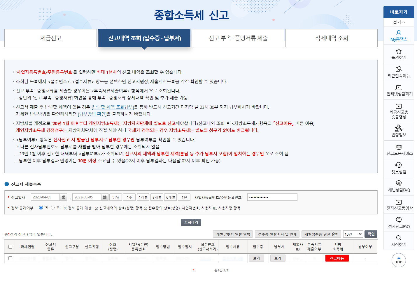 신고내역 조회>신고서 제출목록 확인 후 조회하기 버튼 클릭> 조회된 신고내역 납부서 보기 (지방세 신고 서비스인 위텍스로 이동)> 납부서 확인 후 > 지방 소득세 신고이동 버튼 클릭