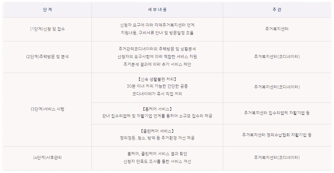 3. 클린 케어 서비스 : 독거노인, 장애가구, 저장 강박, 우울증 등으로 주거 내부 위생관리가 필요한 경우, 청소 등 생활환경 정리를 통해 생활 환경 개선 지원