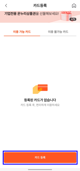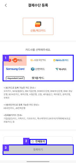 카드는 여러가지가 등록가능하니 목적별로 여러가지를 등록하셔도 됩니다. 카드 등록은 카드등록 버튼 진입 후 1. 카드사 선택 2. 전체 동의 3. 등록하기 버튼 클릭 후 카드 정보를 입력해 간편하게 등록가능합니다.