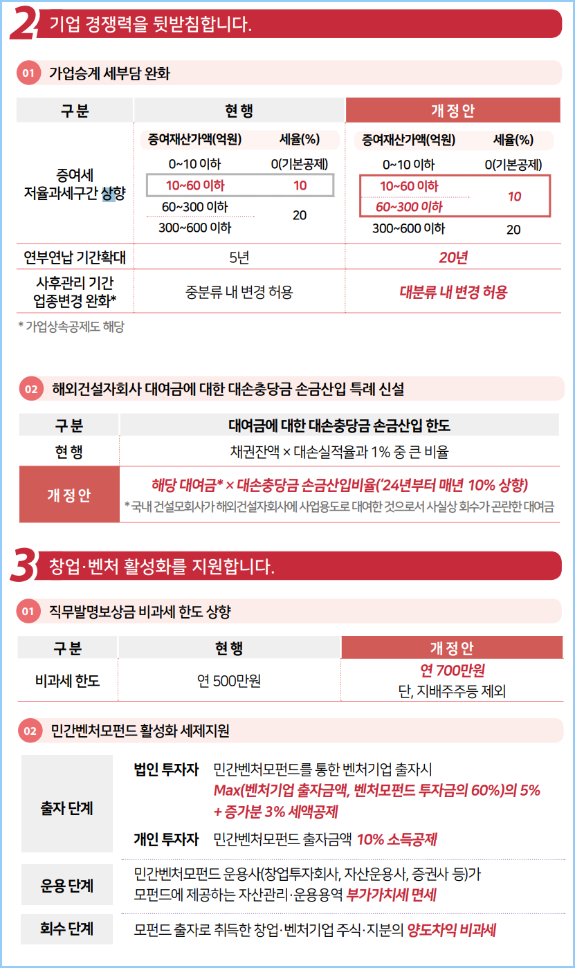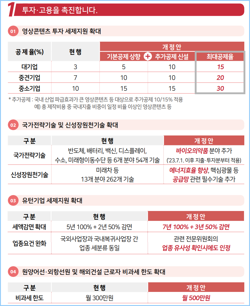 먼저 투자와 고용을 촉진하고 기업 경쟁력을 강화하며, 창업 벤처 활성화를 통해 기업 경제에 활력을 주고자 합니다. 특히 영상 콘텐츠 투자에 대한 세제 지원이 확대되고 국가 전략기술 및 신성장원천기술분야를 확대해 해당 분야에 대한 세제 지원을 강화할 것으로 보입니다.