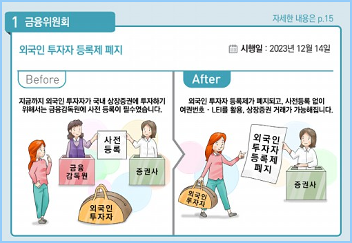 앞서 말씀드렸다시피 그동안 외국인 투자자 등록제는 글로벌 투자시장에서 경쟁력을 약화시키는 요소로 문제가 제기되어 왔는데요. 이번 2023년 12월 14일 부터는 외국인 투자자가 사전 등록 없이 여권번호, LEI를 활용해 상장 증권의 거래가 가능해진다고 합니다.