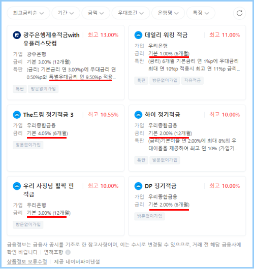 실제로 네이버에 적금 금리를 비교해 보면, 5%~13%(2023. 09 기준)까지 다양한 상품이 있으나, 대부분 앞서 언급한 두 가지, 우대금리를 받기 위해 특정 조건이나 자격을 요하거나 기간이 매우 짧은 상품입니다.