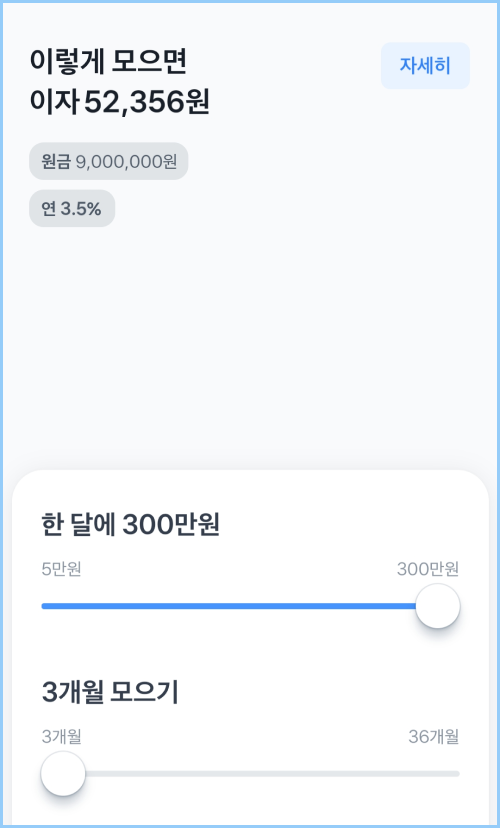 아래와 같이 적금금리를 적용할 경우, 월 50만원씩 3년간 납입했을 때 예상되는 세전이자는 1,389,040원, 월 20만 원씩 3년간 납입한 경우, 555,616원의 이자가 예상됩니다.