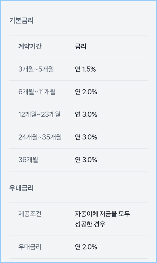 | 기간 | 기본금리 | 우대금리 | 적금 성공 시 최종 금리 |