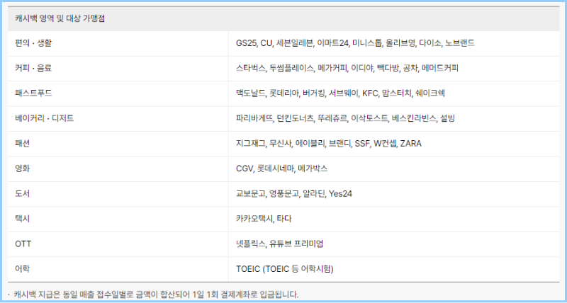 놀라운 점은 해당 혜택은 전월실적과 무관하게 주어지는 혜택이라는 것입니다. 전월 실적이 없는 경우 300원, 전월 30만 원 이상 결제 시 500원까지 제공되며, 혜택은 각 영역별 1일 1회 기준으로 제공된다고 합니다. 10개 영역, 다양한 브랜드에서 제공되는 캐시백 브랜드를 확인해 보시기 바랍니다.