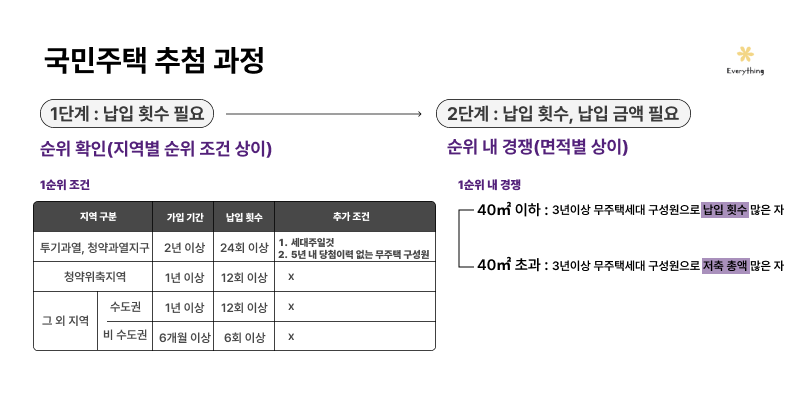 먼저, 국민주택 추첨은 1단계에서 본인의 순위를 확인합니다. 순위는 1순위와 2순위 두 가지로 나뉘는데요. 1순위에 해당되지 않은 경우 자동으로 2순위에 해당됩니다. 청약 주택이 2년 이상, 납입 횟수가 24회 차 이상되면서 세대주이며, 5년 내 세대 구성원이 청약 당첨이력이 없는 경우 지역과 관계없이 1순위가 됩니다.