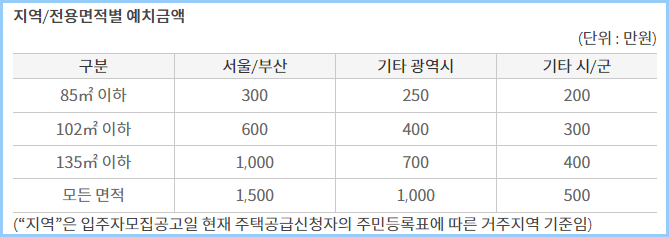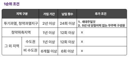 | 1순위 | 1. 3년 이상의 무주택 구성원 2. 저축 총액이 많은자 |