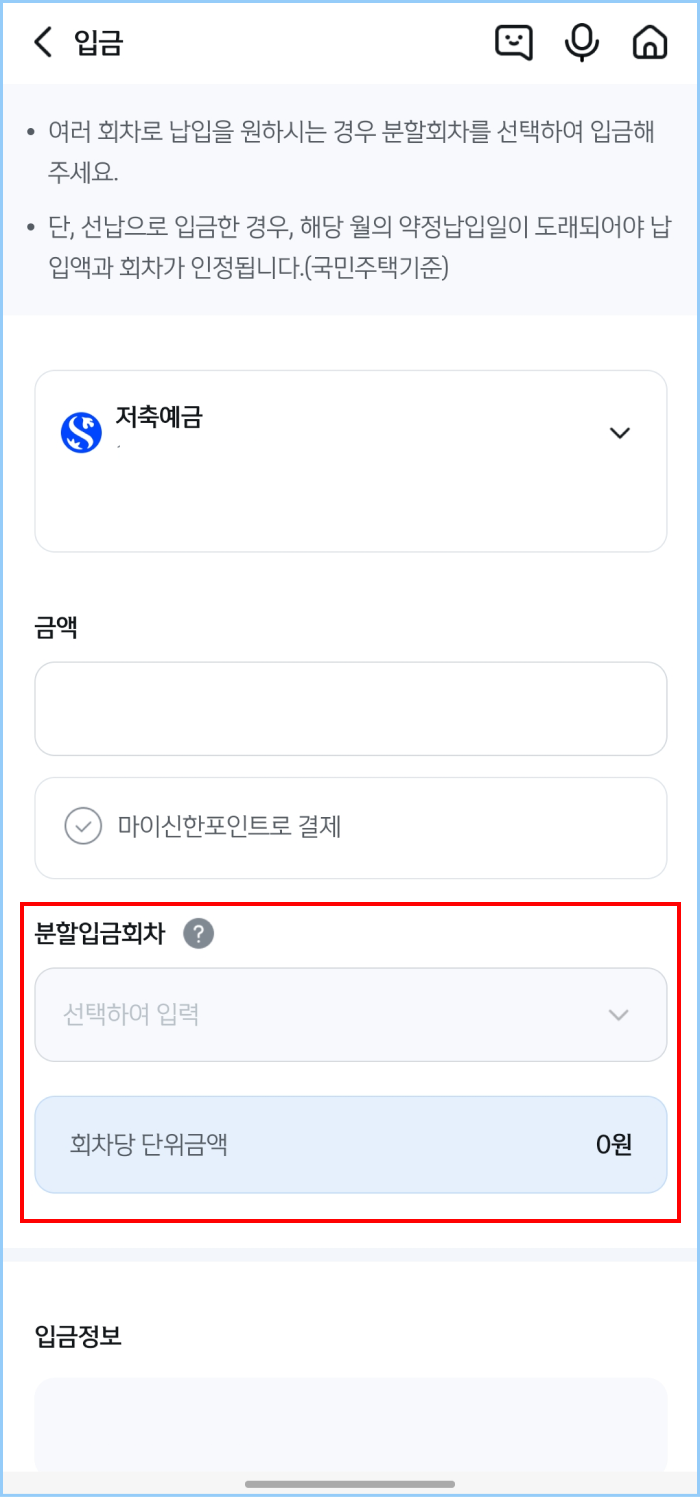 월 10만원 자동이체와 별개로 나머지 금액(180만 원)은 저축통장이 있는 은행에 들어가셔서 분할납입회차입금을 진행해 주시면 됩니다. 신한은행을 기준으로 청약통장에 들어가서 이체버튼을 누르면 일반입금 방식과 함께 분할납입 이체가 있습니다. 해당 180만 원을 단위금액 10만 원에 맞추어 180만 원을 입금하시면 18회 추가 납입을 인정받으실 수 있습니다.