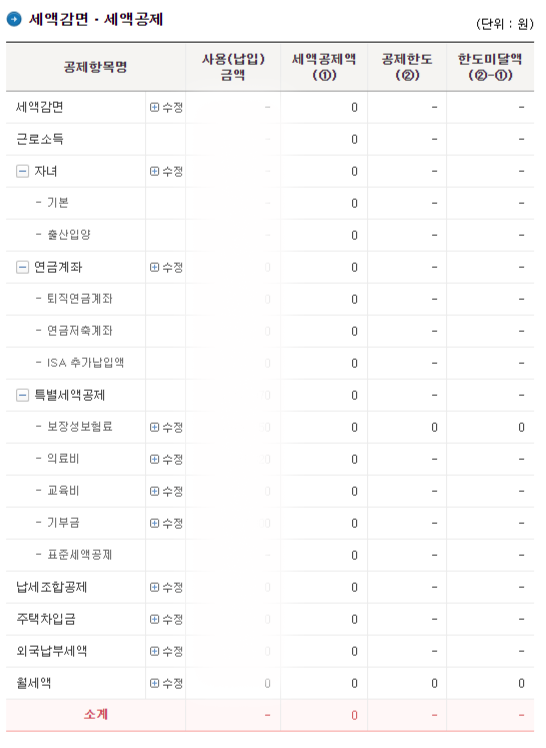 4. 추가로 자동계산되지 않지만 나에게 해당되는 소득공제 또는 세액공제가 있다면 "+수정"을 눌러 반영합니다.