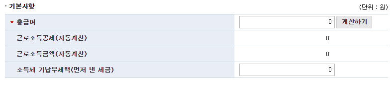 - 소득세 기납부세액 : 매월 월급명세서상 납부한 소득세+지방소득세 합산액