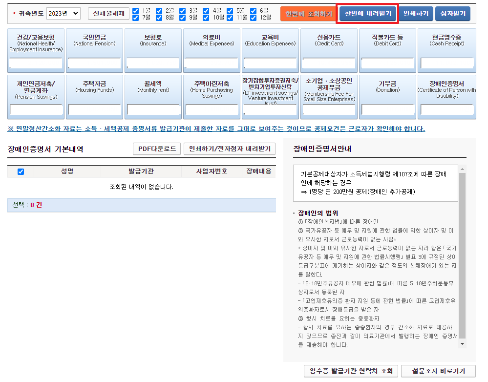 4. 한번에 조회하기 클릭시, 건강/고용보험 부터 장애인 증명서 단계까지 순차적으로 각 항목에 해당하는 1년간의 지출내역이 조회됩니다. 조회 완료 후 한 번에 내려받기를 클릭하시면 pdf파일을 다운받으실 수 있습니다.