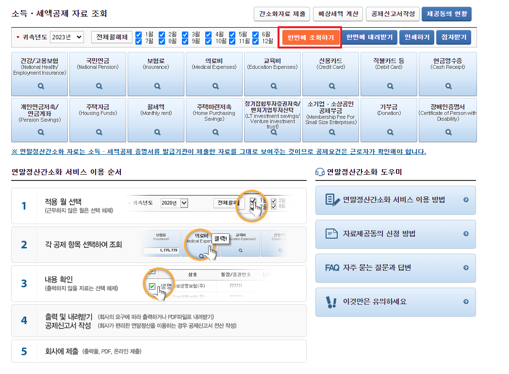 3. 소득 /세액 공제 자료 조회에서 주황색 한번에 조회하기를 클릭합니다.