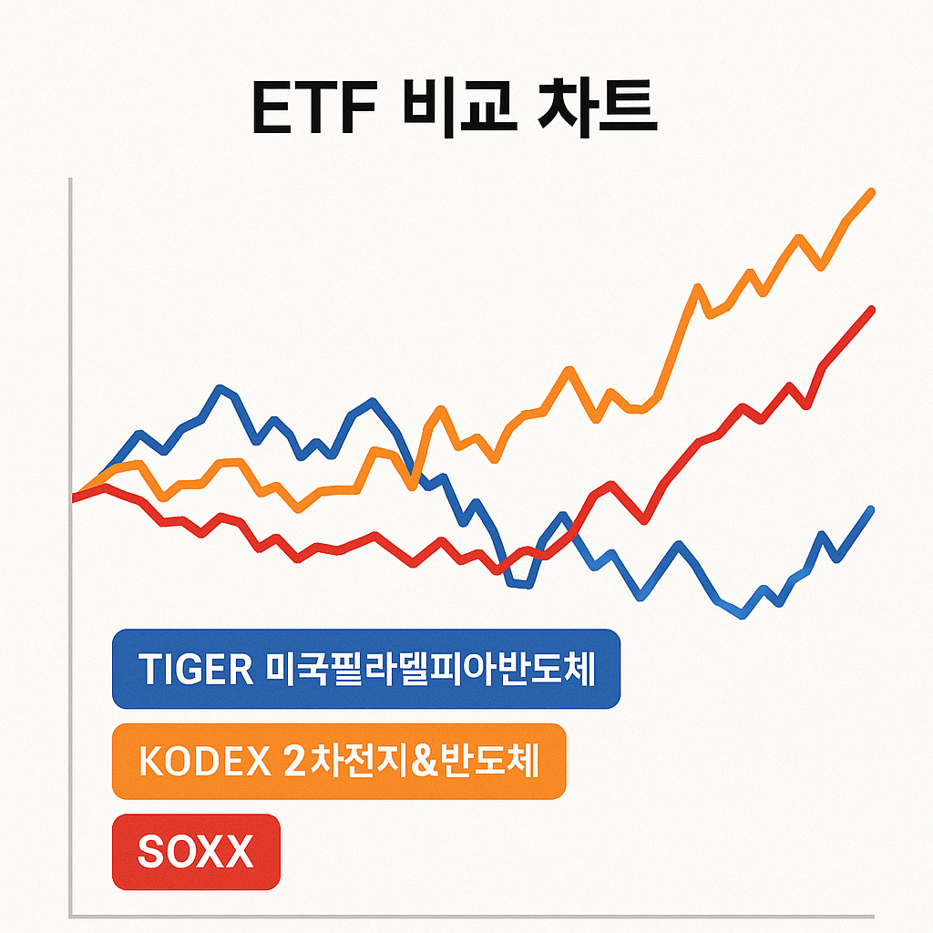 - (국내 ETF) TIGER 미국필라델피아반도체나스닥: "엔비디아, AMD... 하나씩 사기 부담스러워!" 하시는 분들께 딱! 미국 반도체 대장주들을 쇼핑하듯 한 번에 담을 수 있습니다.